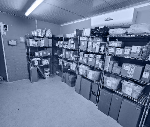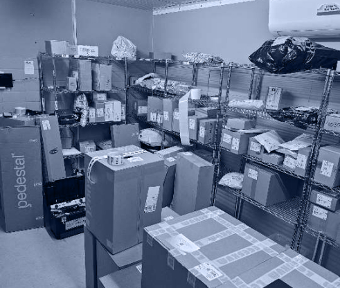 Mange pakker i et uoverskueligt lokale. Medarbejderen skal bruge ekstra tid for at lokalisere, når der ikke er faste placeringer og information.